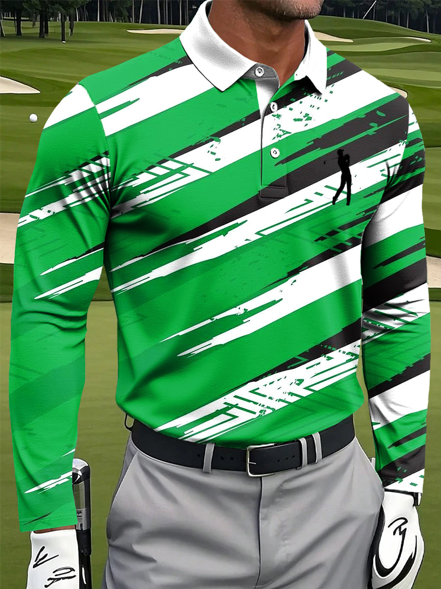 Мъжки ретро абстрактна цветна ивица печат случайни бизнес поло с дълги ръкави