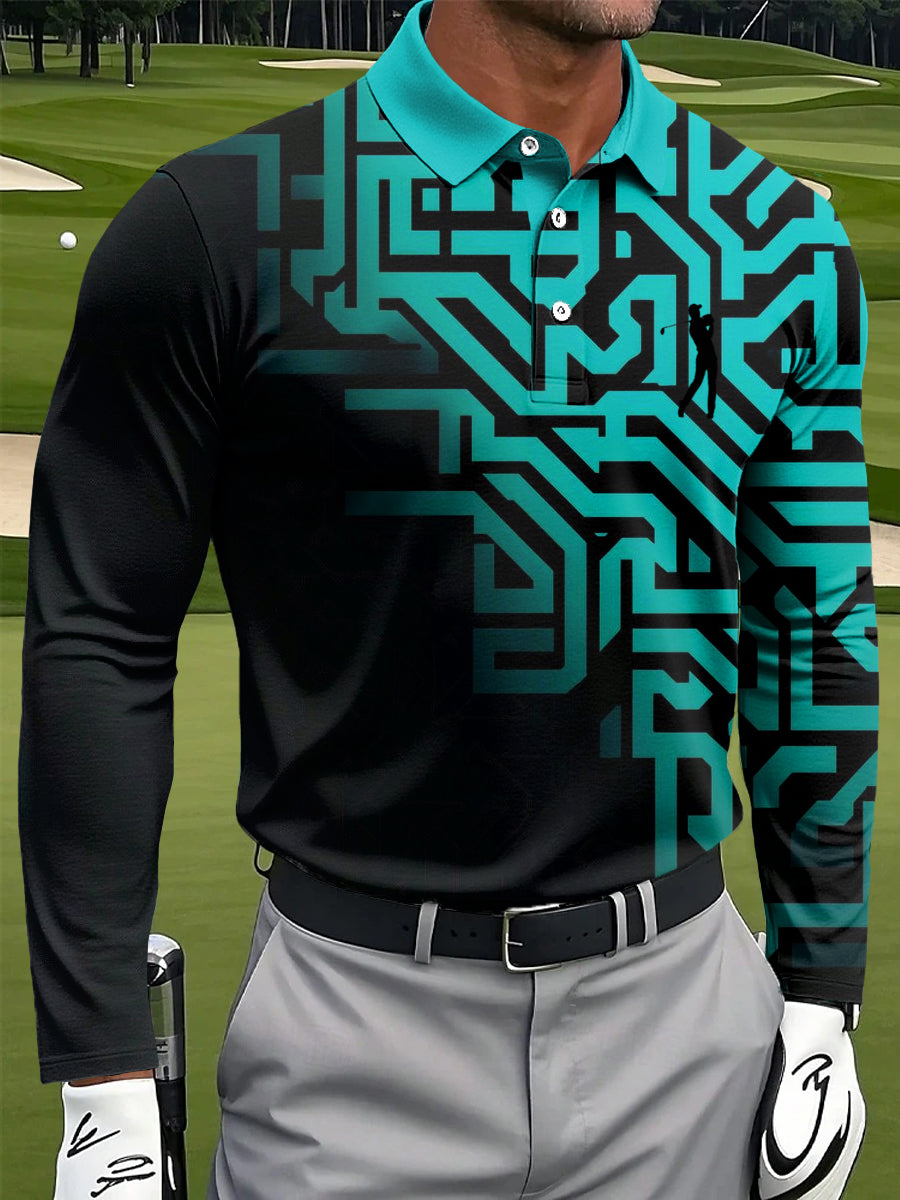 Мъжки ретро градиент геометричен печат случайни дълги ръкави поло риза