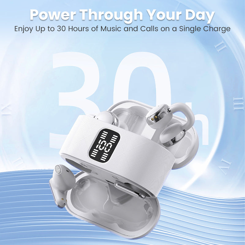 УДЪЛЖЕНО 30-ЧАСОВО ВРЕМЕ ЗА ВЪЗПРОИЗВЕЖДАНЕ: Използвайте ги през целия ден и повече с кутията за зареждане. Тя осигурява общо 30 часа живот на батерията, освобождавайки ви от постоянно зареждане и позволявайки ви да се наслаждавате на музиката си без притеснения.