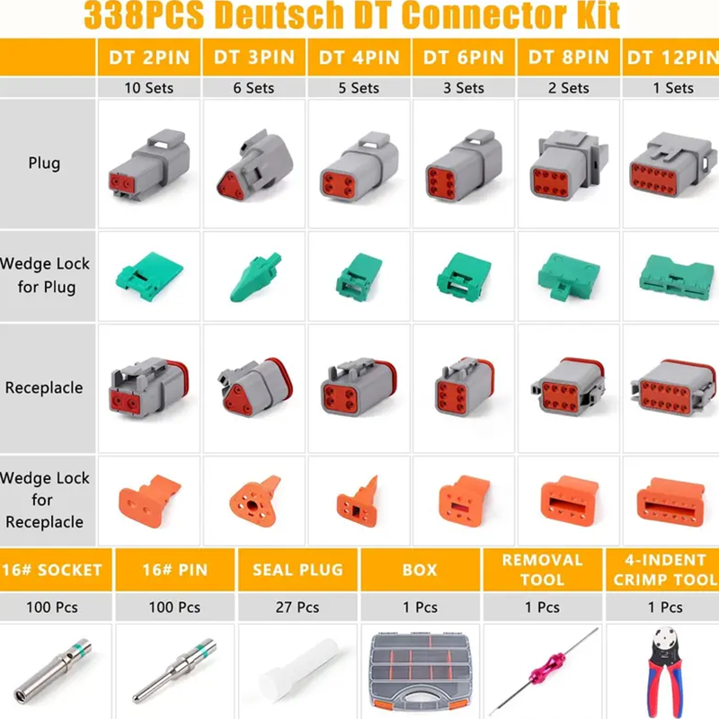 Пакетът включва: 1×338 бройки комплект инструменти за кримпване за DT конектори