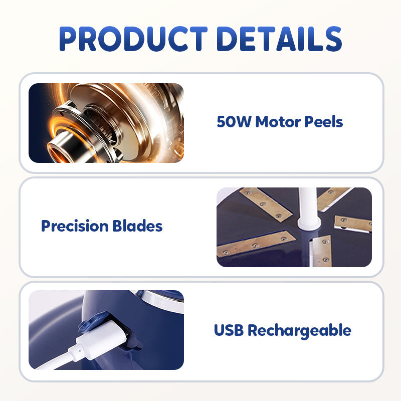 ОБЕЛВАЙТЕ КАТО ПО ВЪЛШЕБСТВО, БЕЗ УСИЛИЯ, БЕЗ БЪРКОТИЯ – Просто натиснете бутона и оставете машината да свърши работата – перфектно обелени плодове за 25 секунди. 50-ватовият мотор обелва мощно, но остава безшумен благодарение на интелигентната технология за охлаждане, която предотвратява прегряването.