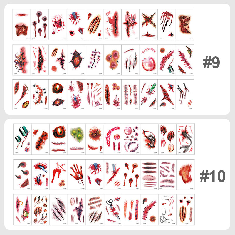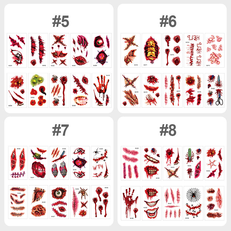 【Голям размер】Всяка татуировка е с размери около 5,7x9,7 см и всяка включва всички видове рани, достатъчни, за да изглеждате като страховит герой с много рани, които подхождат на козплея и грима на вашите приятели/семейство за Хелоуин. Чудесен трик, с който да изненадате и изплашите приятелите си.