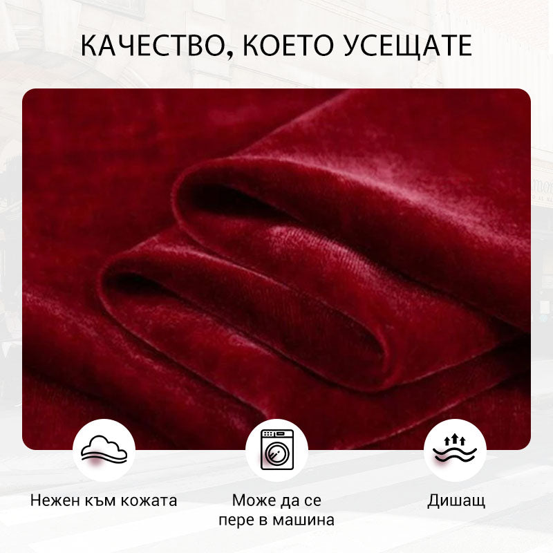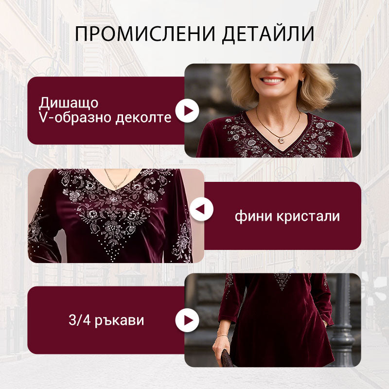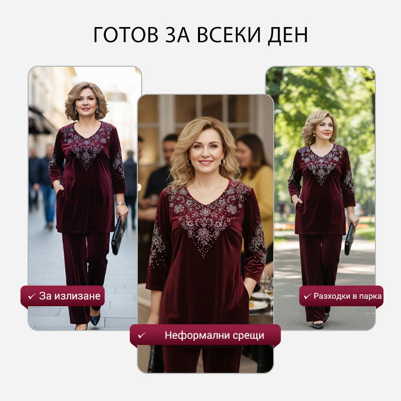 Дамски комплект от кадифена блуза с кристали и панталони