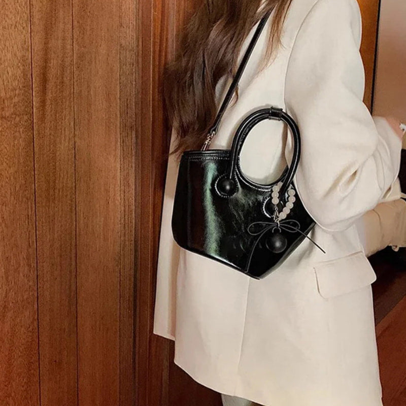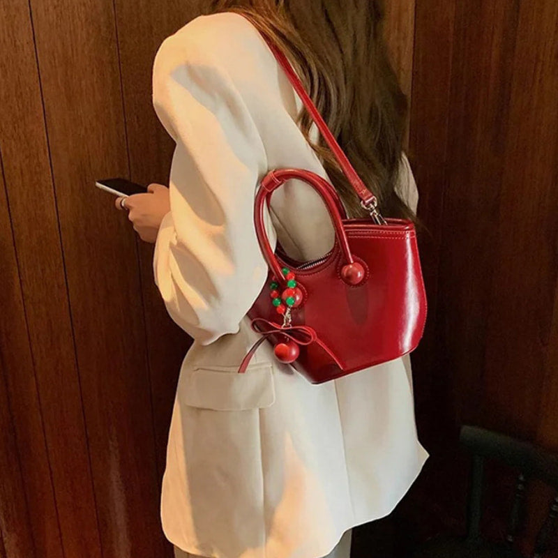 ЕЛЕГАНТЕН ДЕТАЙЛ С ЧЕРЕША: Тази чанта има елегантен етикет с форма на череша, който добавя уникално и закачливо докосване, превръщайки я в забележителен аксесоар, който ще издигне всеки тоалет със своя причудлив чар.