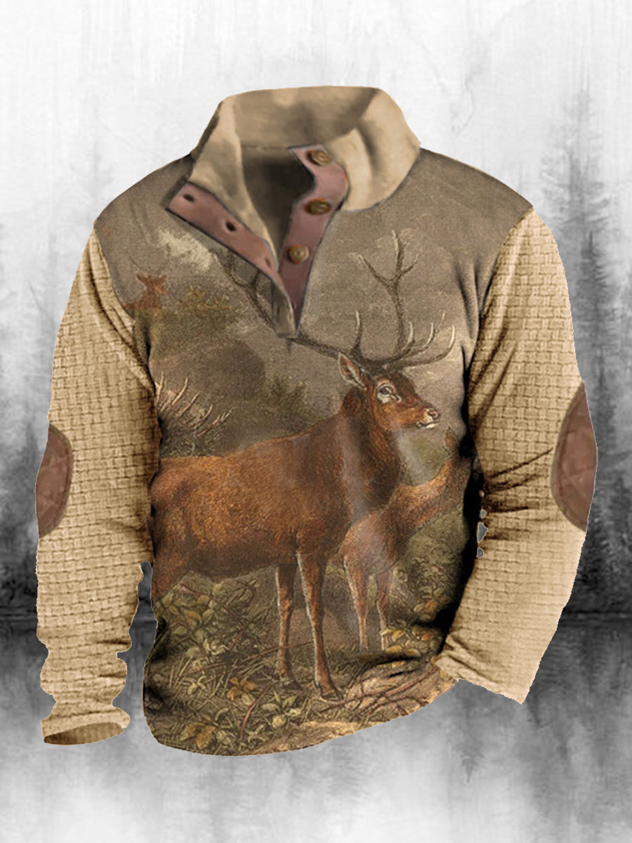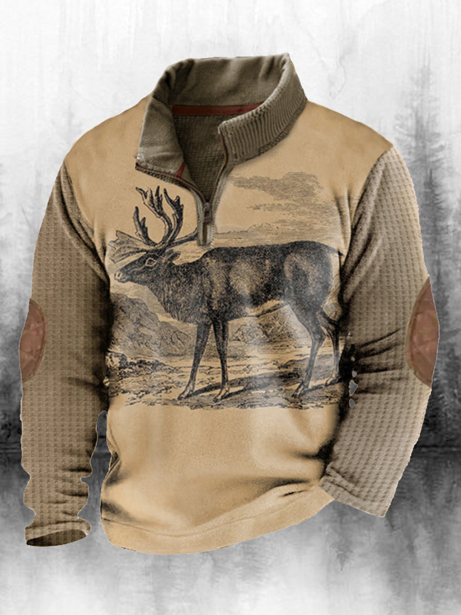 Мъжки ретро етнически печат висока яка половин цип дълъг ръкав отгоре