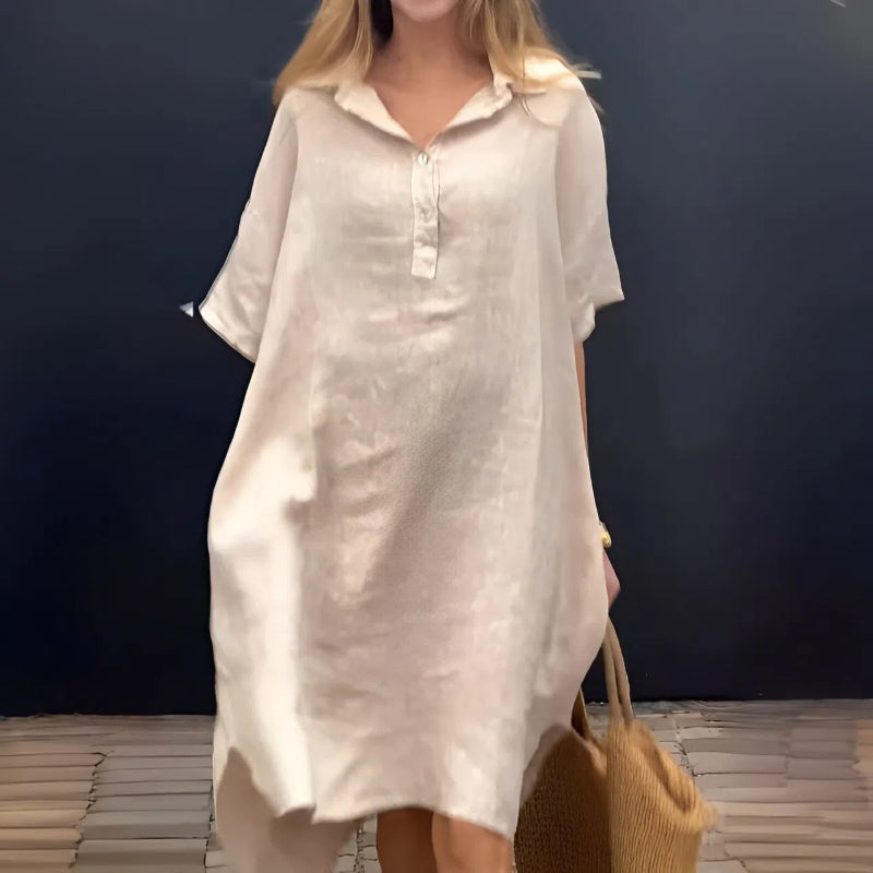 КЛАСИЧЕСКИ ДЕТАЙЛИ НА РИЗАТА - Тази рокля е с традиционна яка на риза, която позволява регулиране на деколтето, въплъщавайки непреходен чар и преминавайки безпроблемно от ден към вечер.