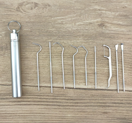 - Преносими клечки за зъби от неръждаема стомана вместо евтините и слаби инструменти за остъргване на зъби. Тя е изработена от гладък метал от неръждаема стомана с максимална здравина.