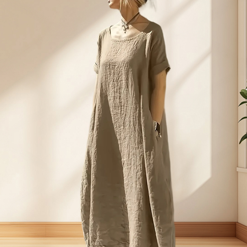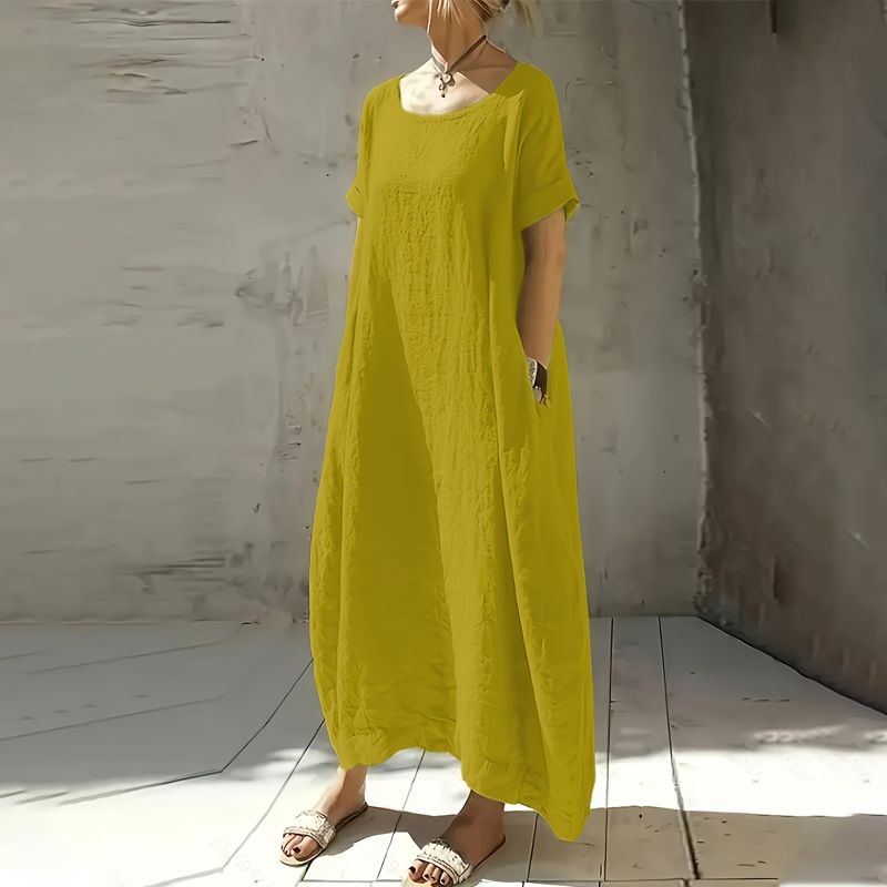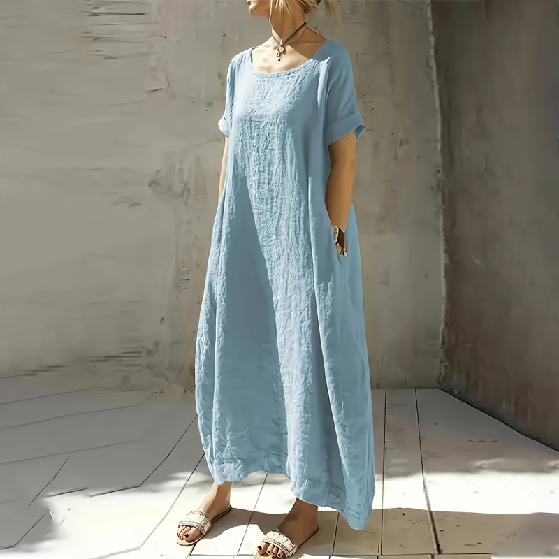 Класическата рокля с кръгло деколте и къс ръкав в едноцветен цвят е стилна и универсална. Минималистичният дизайн гарантира, че тя може лесно да се съчетае с различни аксесоари, което я превръща в основна част от гардероба за всеки сезон.