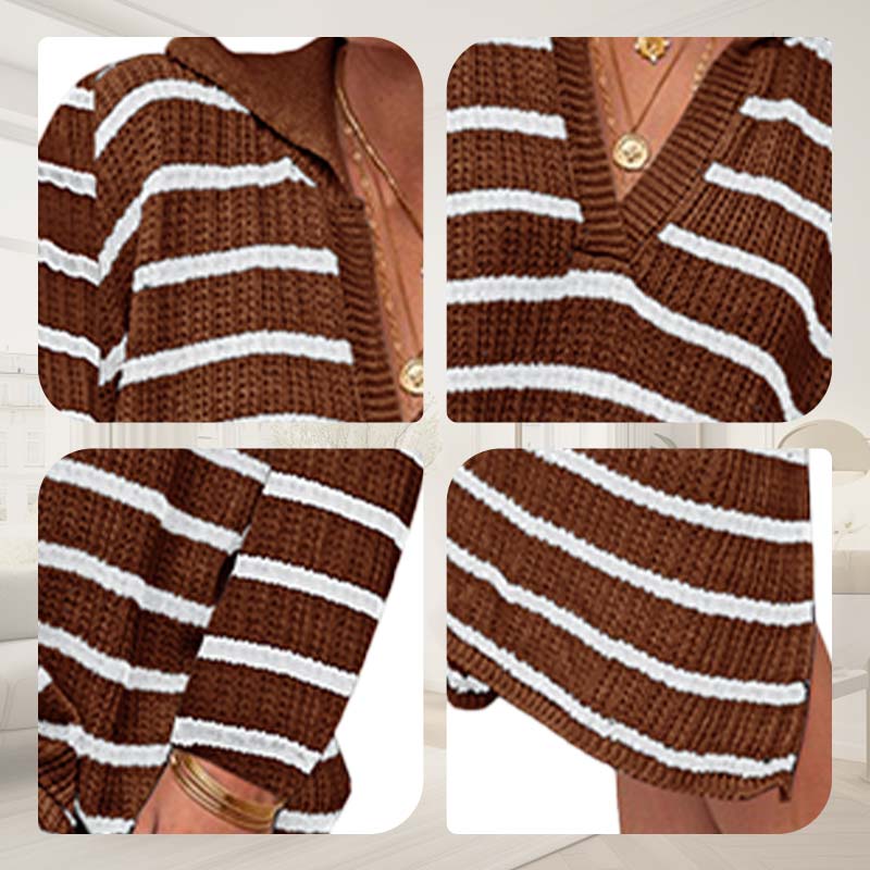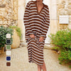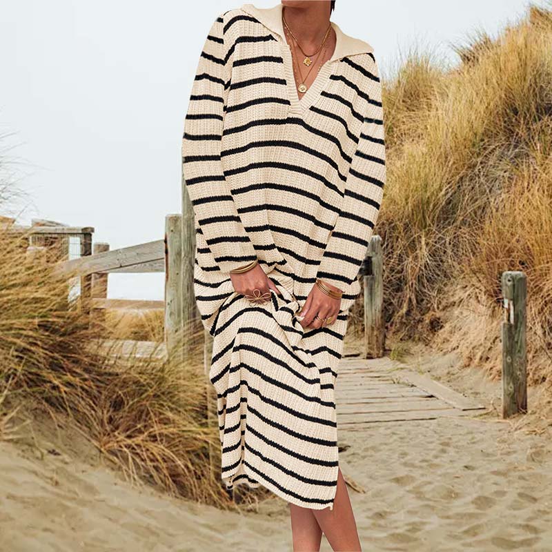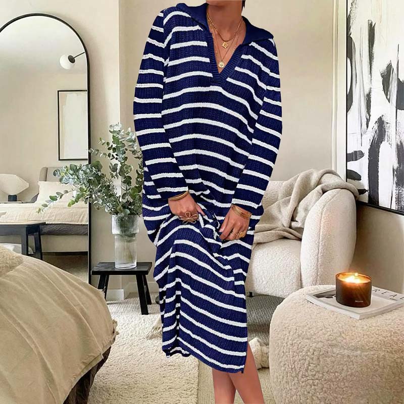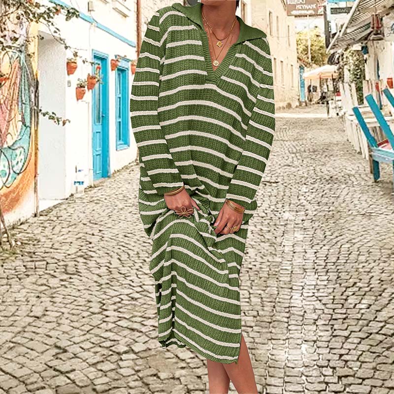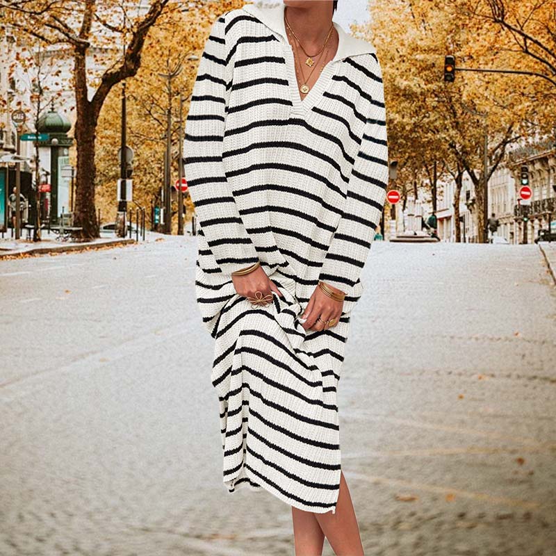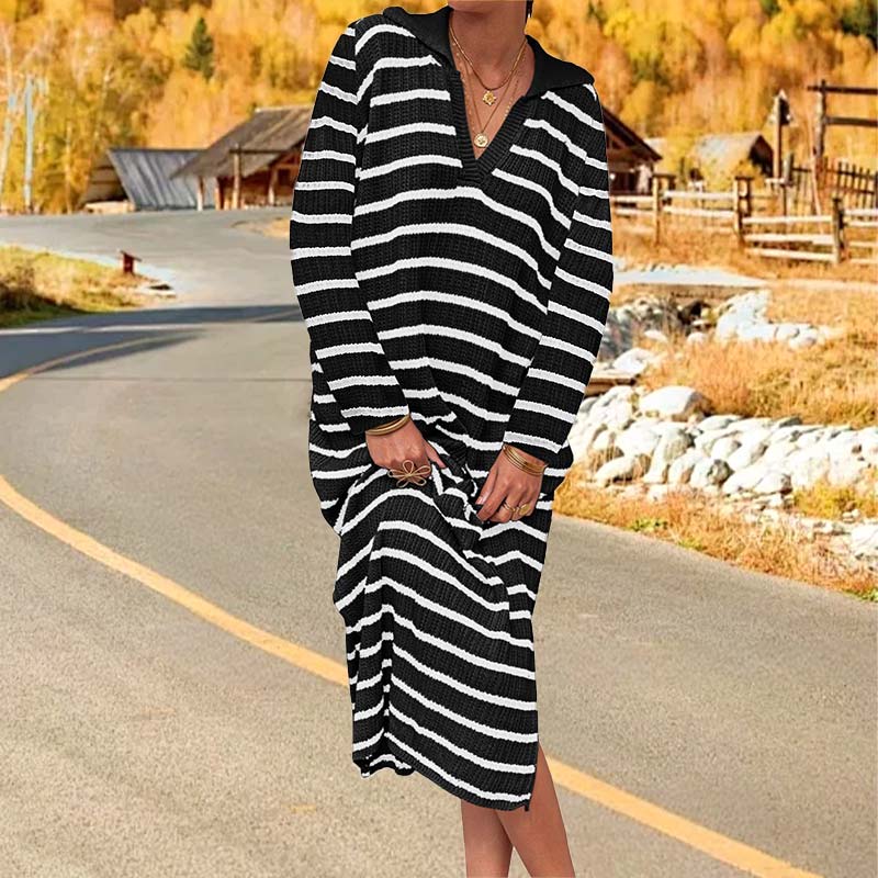 Включено в пакета: 1*Елегантна рокля с V-образно деколте, райета и разцепен подгъв