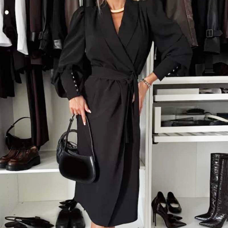 ДЪЛЪГ РЪКАВ И V-ОБРАЗНО ДЕКОЛТЕ: С дълъг ръкав и ласкаво V-образно деколте тази рокля съчетава удобство и изтънченост. Дизайнът предлага топлина за по-хладните дни, като същевременно подчертава деколтето за полиран външен вид.