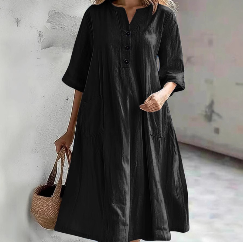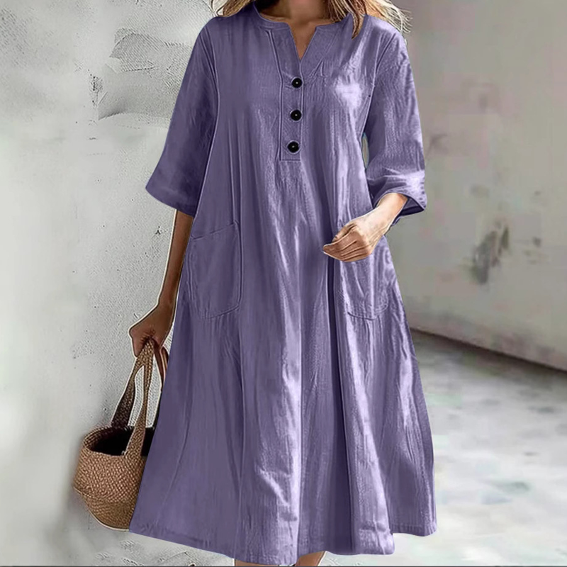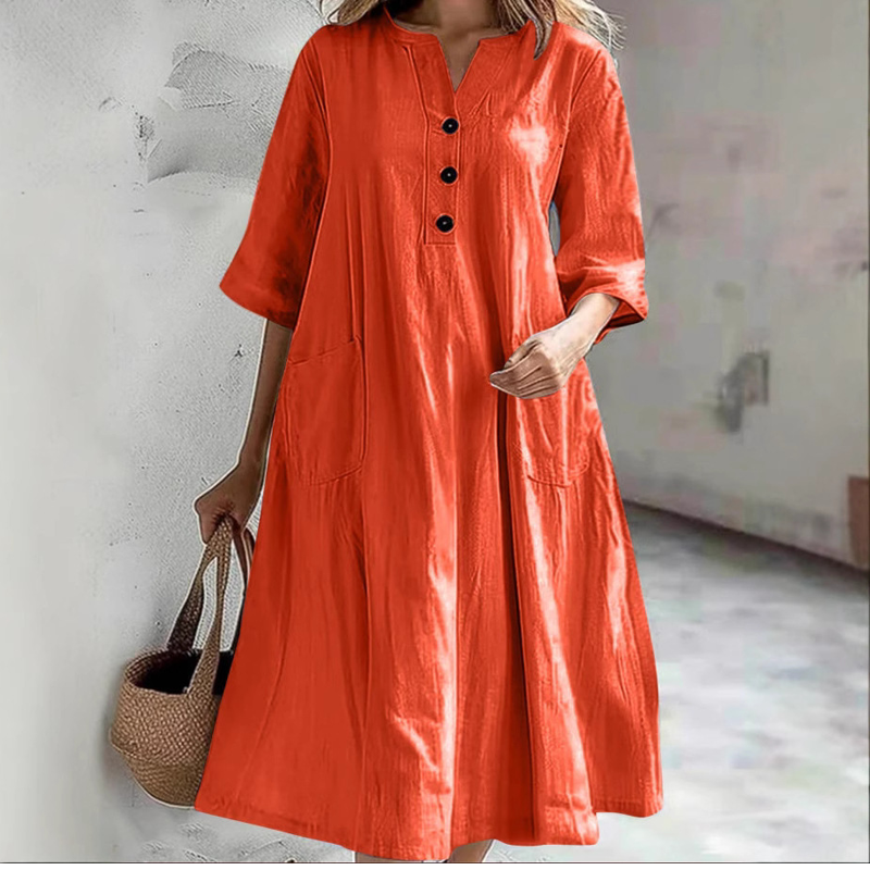 ЛАСКАТЕЛЕН ДИЗАЙН С V-ОБРАЗНО ДЕКОЛТЕ: Стилното V-образно деколте подчертава деколтето ви и добавя женствено докосване към тази спокойна рокля, като предлага ласкателен вид за всички типове тяло.