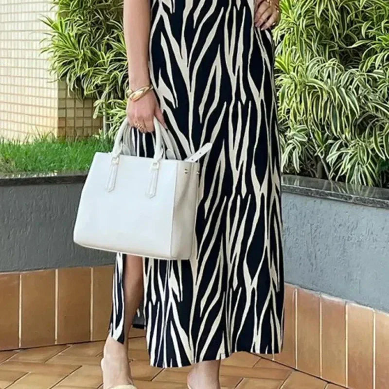 ГЕОМЕТРИЧЕН ПРИНЦИП И ЦВЕТОВЕН БЛОК ДИЗАЙН: Тази рокля се отличава със стилен геометричен принт в комбинация със смел цветен блок в бяло и черно. Тя предлага съвременен, елегантен външен вид, идеален за всекидневно носене.